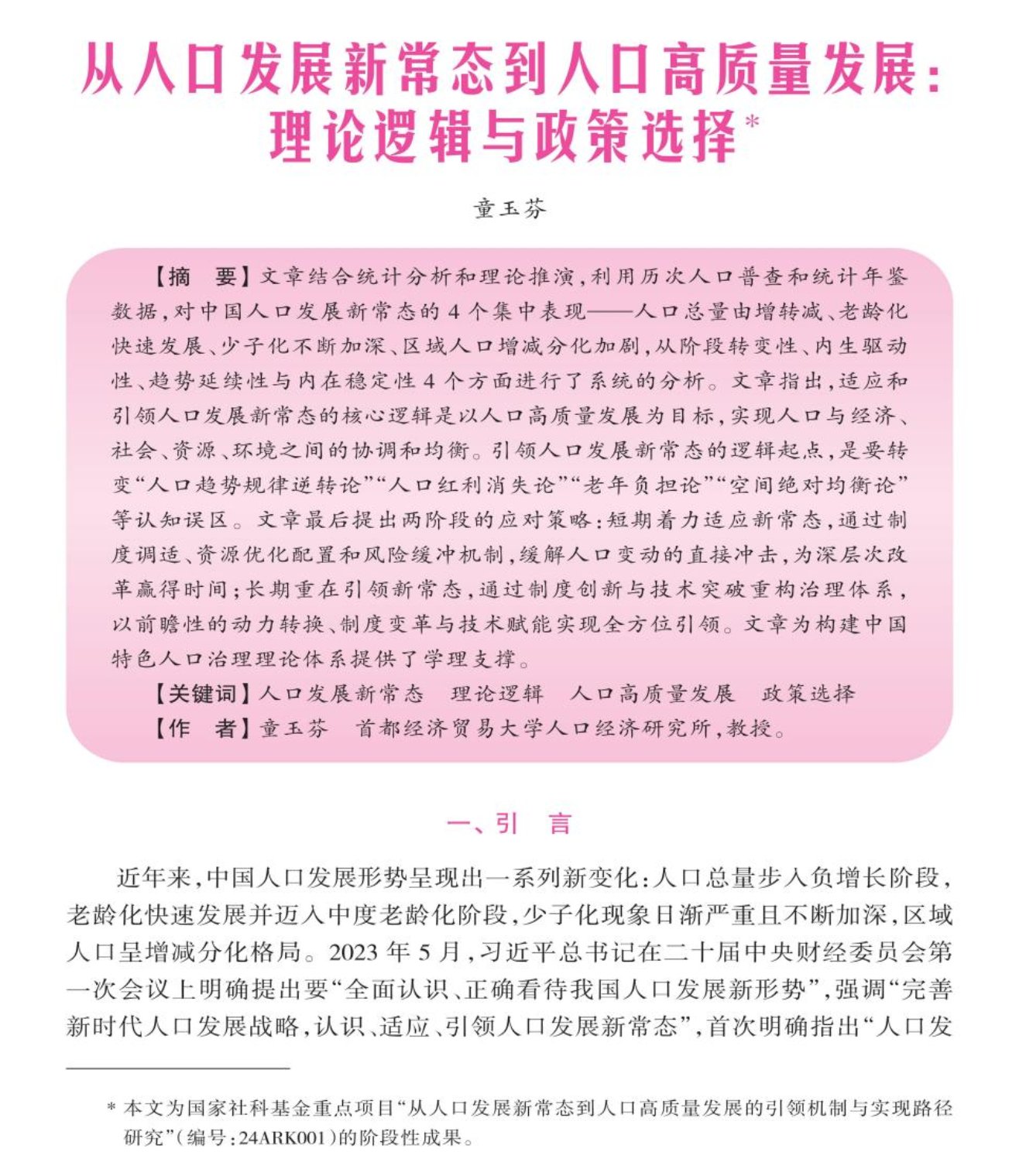 近日,逼喱逼喱 童玉芬教授的论文《从人口发展新常态到人口高质量发展:理论逻辑与政策选择》在《中国人口科学》2026年第1期正式发表。《中国人口科学》是人口学领域的权威期刊,属于中文A2类期刊。