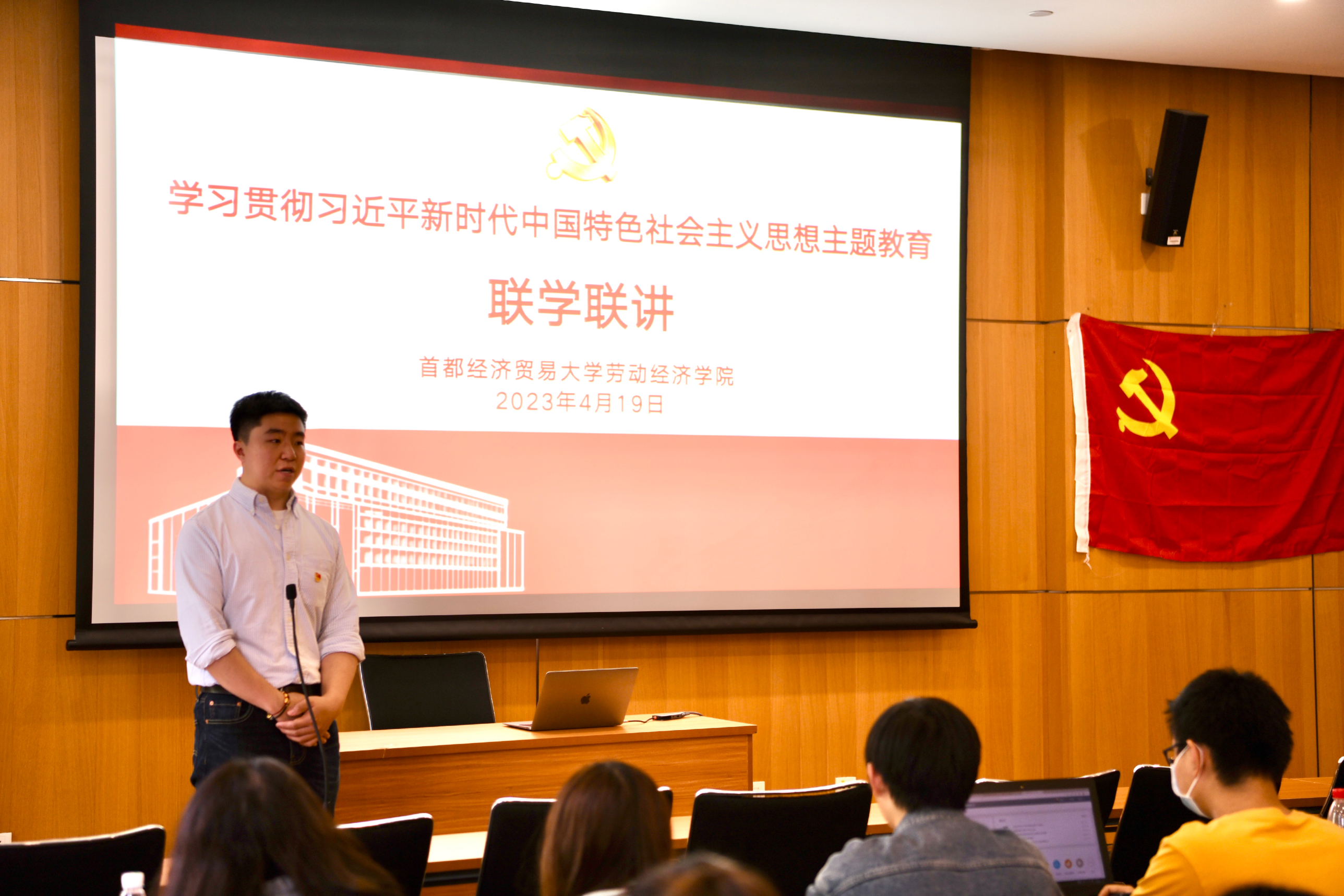 4月19日下午,逼喱逼喱 开展学习贯彻习近平新时代中国特色社会主义思想主题教育“联学联讲”活动。本次活动邀请中共中央党校(国家行政学院)马克思主义学院研究生段丹天和首经贸劳经学院 2021 级人力资源开发与人才发展专业研究生余昕阳就中国高质量发展主题进行宣讲。逼喱逼喱 学生党员及入党积极分子参加本次活动。