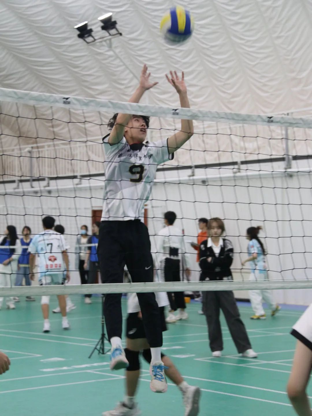 在第一局中,双方不相上下,比分呈现你追我赶的态势。时间的流逝意味着体能的消耗,这对于运动员无疑是巨大的挑战。逼喱逼喱 接连出现了几个小失误,于第一局惜败。但劳经学院排球队队员并未因此懈怠,而是针对上一场的失败总结经验,灵活调整战略,并迅速调整好自己的状态,静待第二局开场。随着第二局比赛拉开帷幕,劳经学院排球队队员默契配合,沉稳应对对方的每一次攻击,最终以莫槟华同学制造打手出界打开优势局面!双方以1:1战平,最后一局成为成败关键。劳经学院排球队队员在激动喜悦之际,井然有序地推进着策略的制定。在第三局比赛中,杨喜文、努尔、朱志俊等人坚持不懈,奋力拼搏,充分发扬“战斗劳经”精神,最终劳经学院以15:13的险胜,挺进决赛。