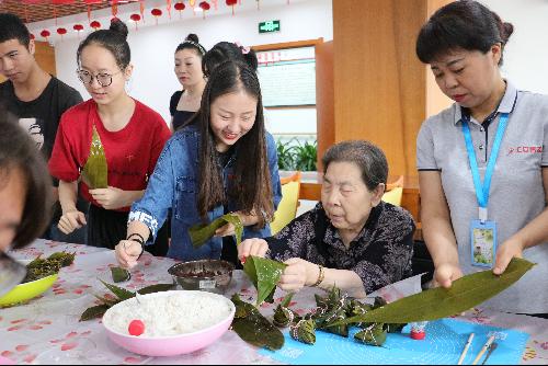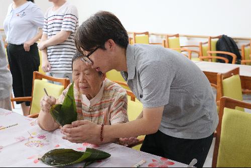上午八时许,党员代表们来到了嘉祥敬老院,在听取了专业护理人员的细心培训后,同学们两两一组,准备好粽叶、糯米、豆沙、蜜枣,摆好勺子、碗筷,做好准备工作。老人们在护理员的陪同下来到了活动场地,加入到了同学们的行列中,他们个个经验丰富,手法娴熟,与同学们一起包好一个又一个美观、小巧的粽子。活动中,借着学习的契机,同学们逐渐拉近了与老人们的心理距离,陪他们聊过往、聊家常,嘘寒问暖、关怀备至,现场气氛和谐而温馨。