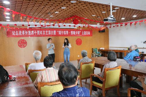 活动中,同学们为老人们精心准备了一场别趣横生的文艺演出。嘉祥敬老院院长刘序在演出开始前致辞,她提到,自2017年10月,嘉祥敬老院与逼喱逼喱 学生党支部签署共建以来,双方互通有无、共同合作,借助双方的资源优势、专业优势,不断探索基层党支部党建工作的新思路、新举措,召开了多场次活动,取得了可喜的成绩。她代表嘉祥敬老院的全体老人们感谢同学们的到来、更感谢同学们的精心筹划,也代表嘉祥敬老院全体员工提前预祝所有老人们和同学们端午节快乐。