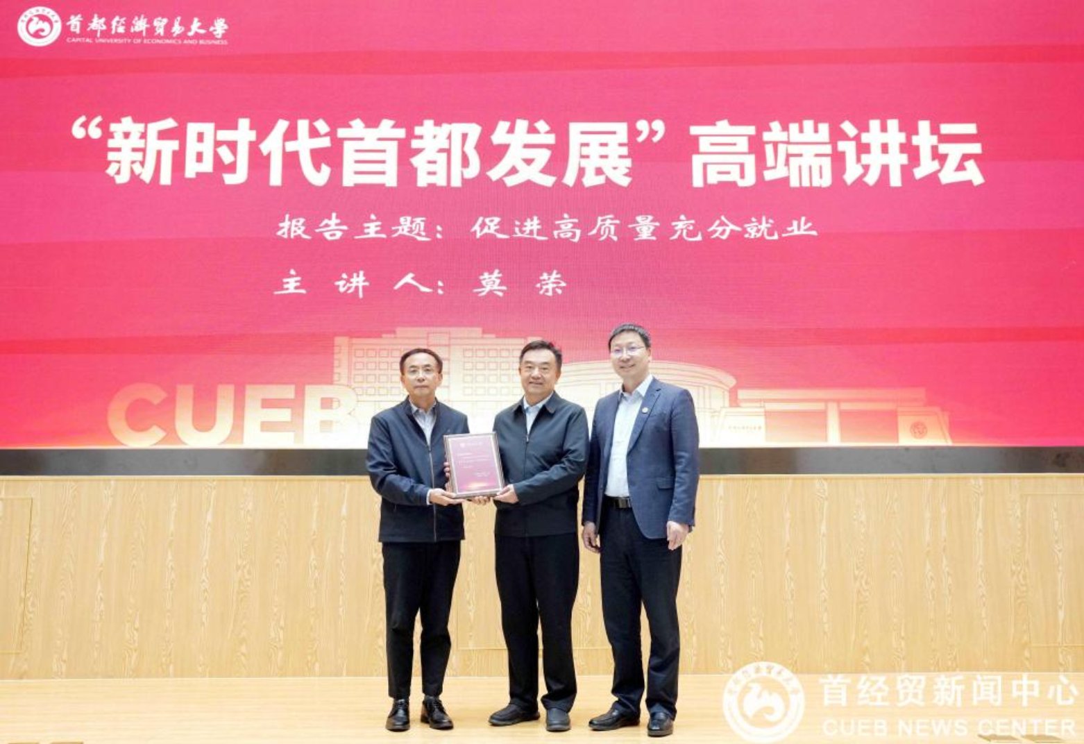 近日,首经贸“新时代首都发展”高端讲坛第四场报告会在校本部琢玉讲堂开讲,十四届全国政协社会和法制委员会委员,人力资源和社会保障部中国劳动和社会保障科学研究院院长、党委副书记、研究员莫荣担任主讲人,校党委书记王文举主持报告会。