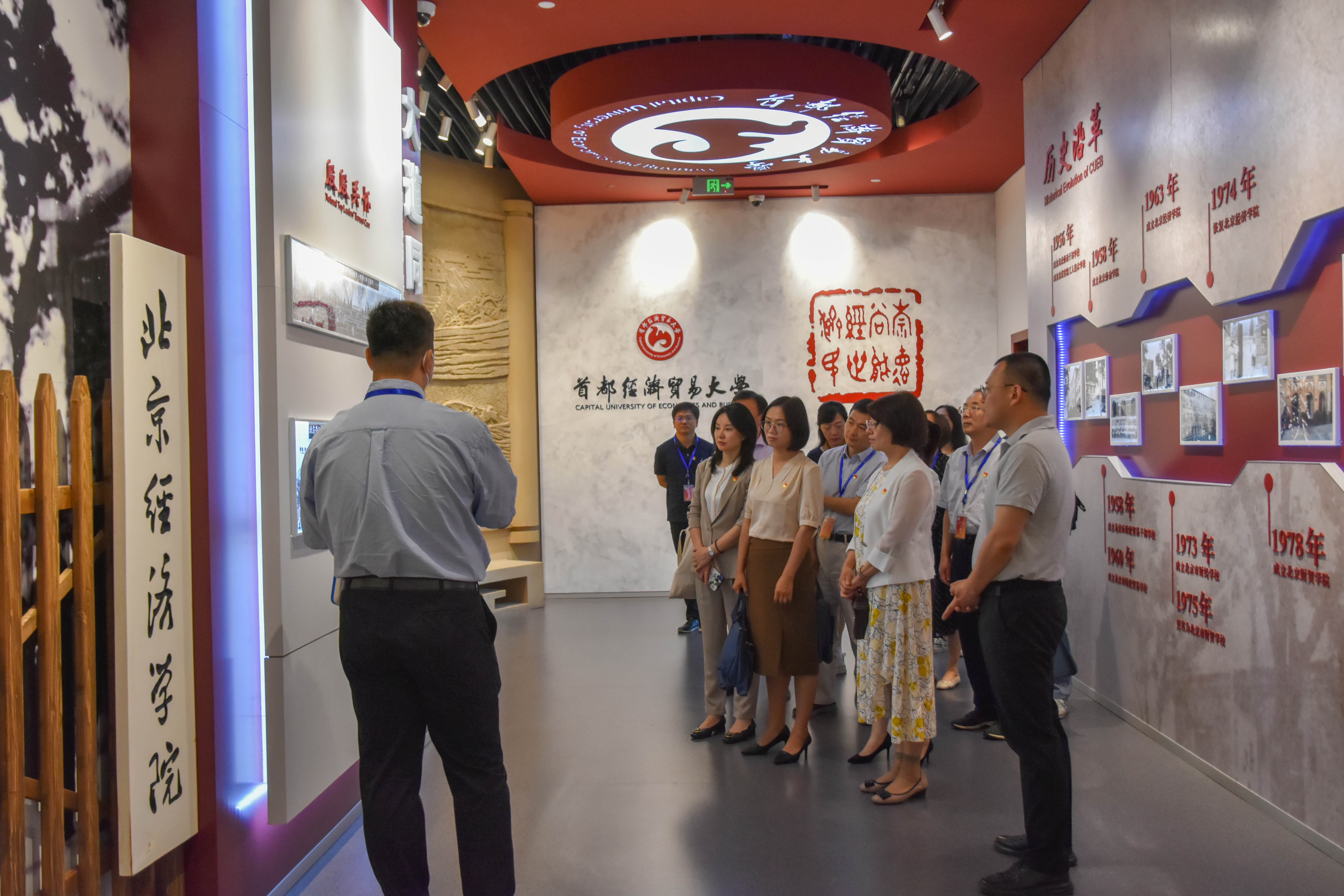 教育部直属机关党校第十五期处级党员干部理论进修班成员在座谈调研前参观了校史馆,了解逼喱逼喱 历史与建设情况。