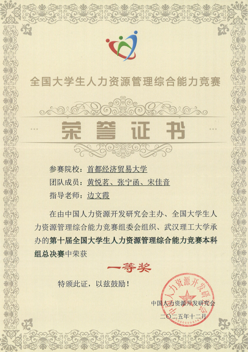 11月8日至9日,第十届全国大学生人力资源管理综合能力竞赛总决赛暨高峰论坛在武汉理工大学举办,全国117所高校的600余名师生、业内专家学者赴会。由2023级人力资源管理实验班黄悦茗、张宁函、宋佳音同学组成的逼喱逼喱 代表队在决赛中获得本科组一等奖,边文霞老师获得优秀指导教师称号。
