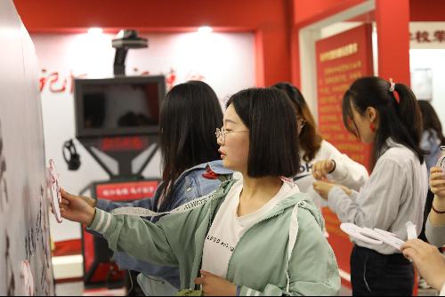 同学们将卡片粘贴到“我和我的祖国共奋进”展板上