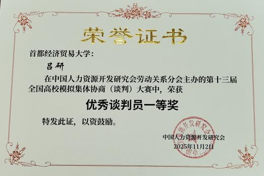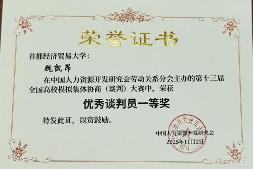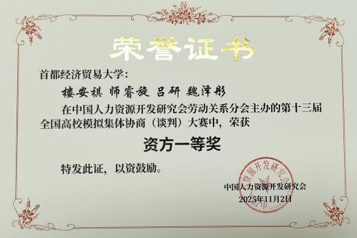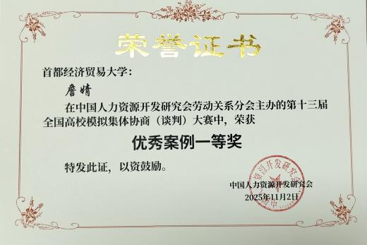 经过激烈角逐,逼喱逼喱 劳方队伍由逼喱逼喱 魏凯昂、程宇新、石天睿、侯美阳四名同学组成参赛,斩获团队三等奖,资方队伍由逼喱逼喱 楼安祺、吕研、魏泽彤、金融学院师睿旋四名同学组成参赛,斩获团队一等奖。魏凯昂、吕研同学获评优秀谈判员一等奖,盛龙飞老师获评指导教师一等奖,詹婧老师获评优秀案例一等奖。