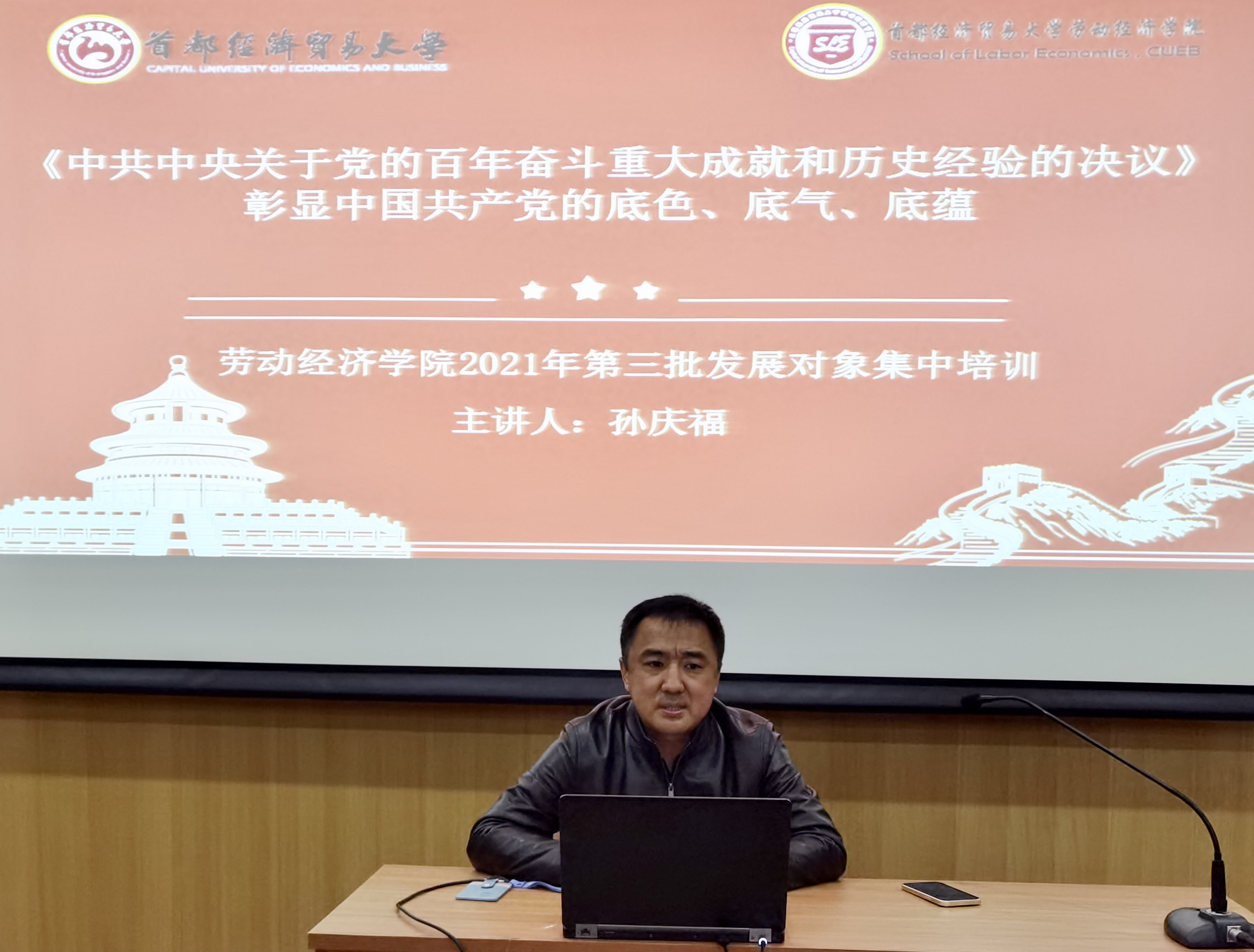 2021年11月15日晚,学院党委副书记孙庆福应邀为党员发展对象讲授题为“党的十九届六中全会彰显中国共产党的底蕴、底色、底气”的主题党课,专题党课于博远楼1号会议室开讲。