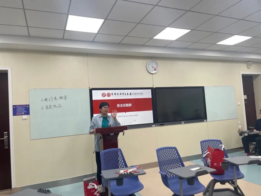 会议第二项由社会工作系主任吕新萍教授致辞,吕新萍教授对社工系新生表示了热烈的欢迎并围绕三点发言,首先指出,社会工作专业是性价比较高的一门科学学科,同学们将迎来全身性的改变。社会工作倡导的是“助人自助、自助助人”,同学们会有更多机会认识自己、了解自己,这也正是社会工作专业的优势所在。其次强调,社会工作是由国家大力支持,落实法律法规具体保障的朝阳专业。我国正在组建中央社会工作部,吸纳协调社情民意,建设“回应型”政府,国家逐步完善相关法律,保障社会工作者的合理性、合法性、合规性。最后表示,社会工作系的专业氛围融洽,班级风气积极向上,师生互相成就、共同成长。社会工作系有诸多外延活动,包括但不限于“同行计划”、“畅聊约咖啡”、“心理成长工坊”。