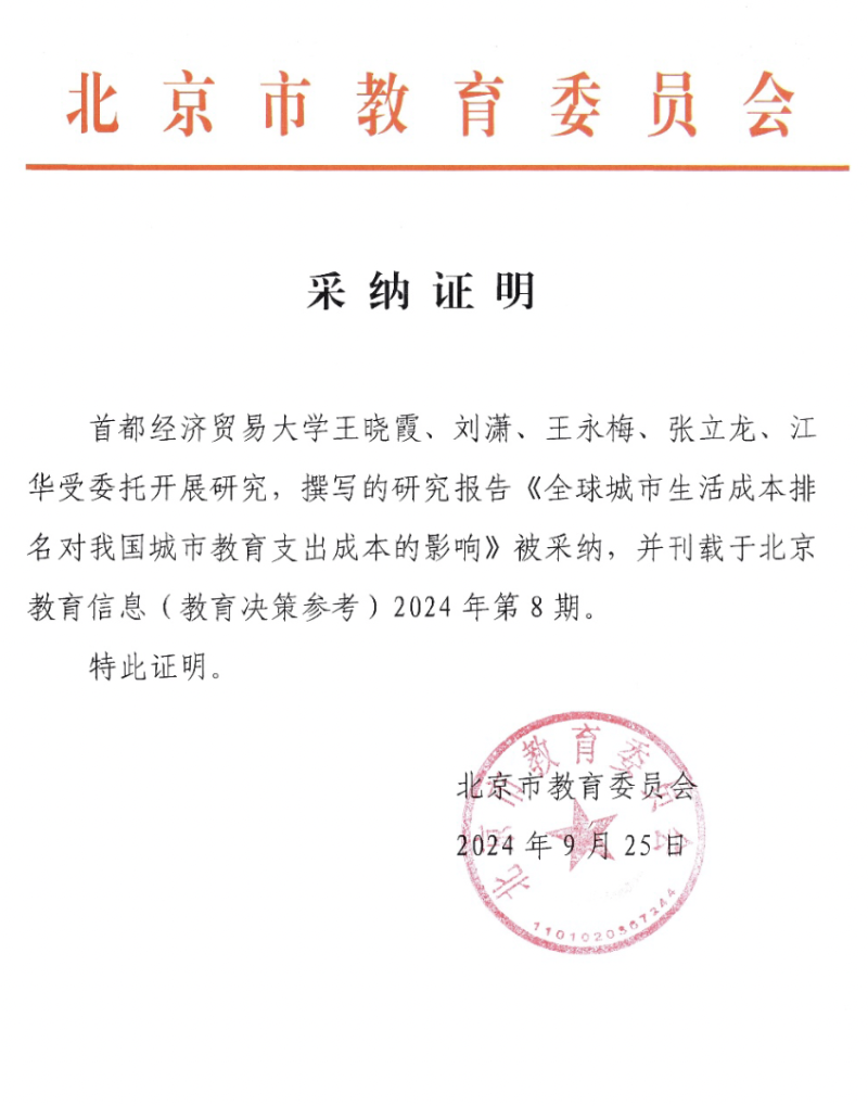 9月25日,逼喱逼喱 收到研究成果采纳证明。学院教师王晓霞、刘潇、王永梅、张立龙、江华合作撰写的研究报告《全球城市生活成本排名对我国城市教育支出成本的影响》被北京市教育委员会采纳,刊载于北京教育信息(教育决策参考)2024年第8期。