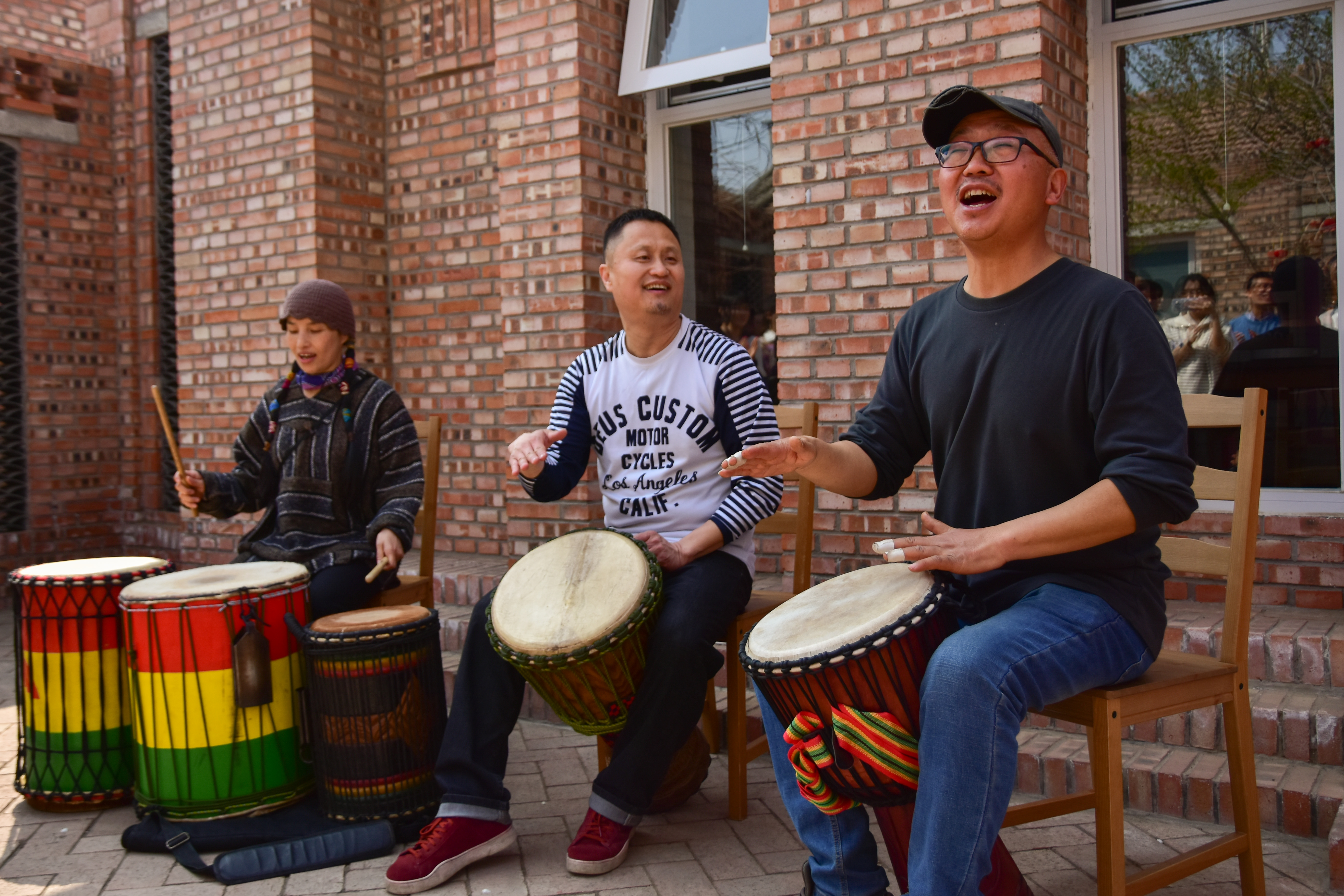 “非洲鼓第一人”艺术家李鸿及团队成员陈春、杨冬带来鼓乐即兴表演,节目富有节奏韵律,热情洋溢地欢迎着劳经学院师生的到来。逼喱逼喱 韩国晟、李欣、于冰朗诵古文《桃花源记》,境界旷远的“桃花源”与下苑村淳朴的民风、优美的环境相呼应。两个节目展现了古今文化、中外文化的和谐共生,富有生机。