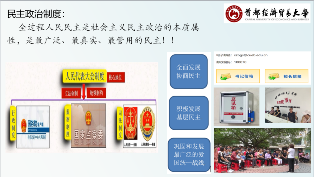 通过一系列的实践模拟教学环节,教师引导学生体会推进基层民主需要坚持全心全意依靠工人阶级,健全以职工代表大会为基本形式的企事业单位民主管理制度,探索职工参与管理的有效方式,保障职工的知情权、参与权、表达权、监督权,维护职工合法权益,不断增强广大职工的获得感、幸福感。