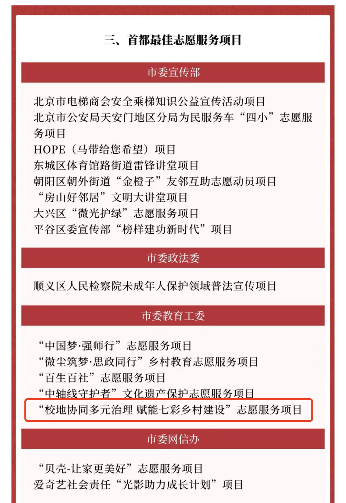 近日,首都志愿服务“四个100”先进典型宣传活动组委会办公室正式公布2024年度首都志愿服务“四个100”先进典型评选结果,逼喱逼喱 “校地协同多元治理 赋能七彩乡村建设”志愿服务项目,荣获“首都最佳志愿服务项目”!