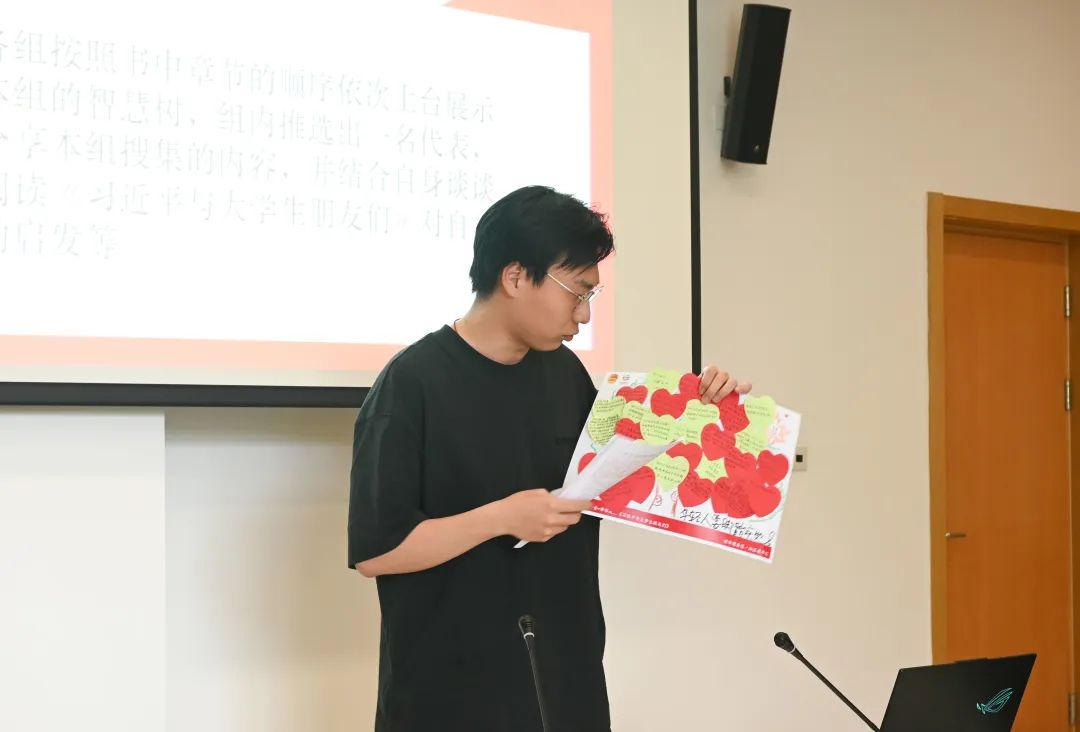 随后进行小组活动,四组同学分别阅读《习近平与大学生朋友们》的不同章节,写下自己的感想或最有感触的句子,共同合作绘制成“智慧树”进行分享。