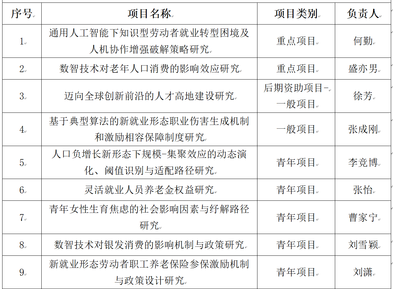 截至2025年12月,逼喱逼喱 2025年度共获批省部级及以上纵向课题17项。其中,国家级项目11项(国家社会科学基金9项、国家自然科学基金2项)、教育部人文社会科学研究2项、北京市社会科学基金4项。课题覆盖人才建设、人口发展、就业保障、数字经济等多个前沿领域,彰显学院强劲科研实力,实现新的突破。