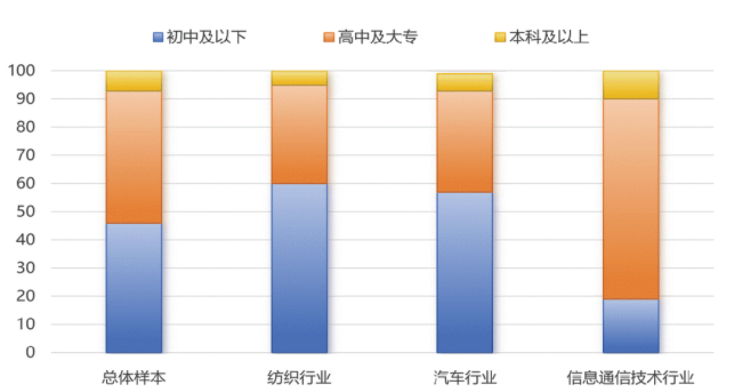 图2 各行业女工受教育程度分布(%)