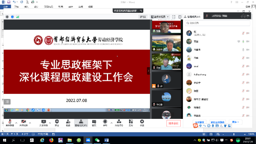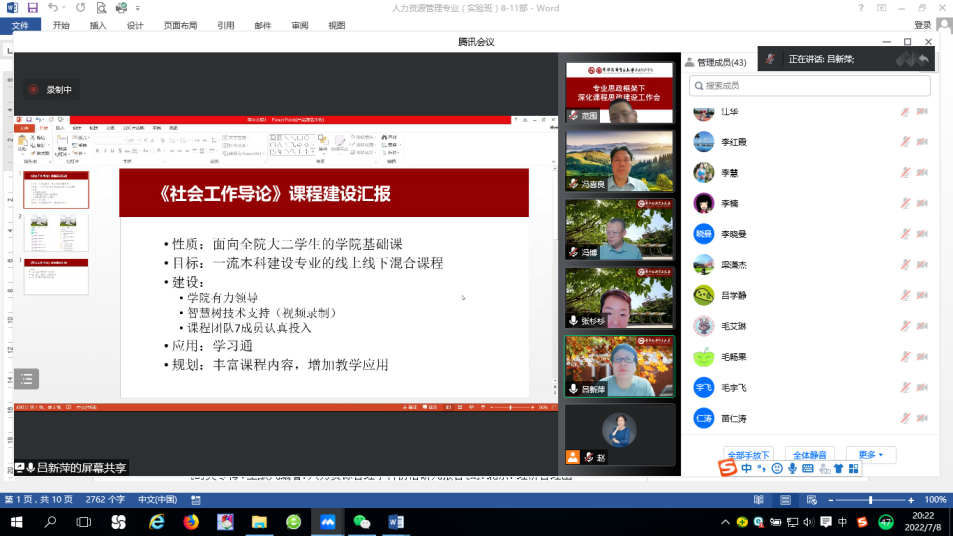 首先,由2021-2022学年承担学院在线课程建设项目的老师汇报课程建设的成效及其未来规划。张杉杉老师汇报《人力资源管理心理学》课程建设情况,该课程共计录制了50个教学视频,活动数达16586次,并修订教材第4版,形成308道题库,张杉杉老师最后提到学习通在线课程在与学生沟通、与老师之间沟通的便利作用。该课程的课件荣获北京市优质本科课件。吕新萍老师汇报《社会工作导论》课程的建设情况。课程主要围绕一流本科建设专业的线上线下混合课程的目标展开,在团队7人认真投入的情况下,丰富了课程内容。郑祁老师汇报《劳动关系学》课程的建设情况。课程总录制时长达550分钟,分为了59节,并分享了在线课程录制过程中将思政元素融会贯通的教学心得。周施恩老师汇报《人力资源管理导论》课程建设情况,并提出将思政元素融入课堂教学,形成逼喱逼喱 特色交叉课程的未来展望,该课程荣获了北京市优质本科课程。江华老师汇报了《社会保障基金管理》混合金课建设的情况。该课程的整体定位为线上学知识,线下长能力。江老师以具体课程为例,详细介绍了如何将思政元素融入课堂,推进课程思政建设的经验。