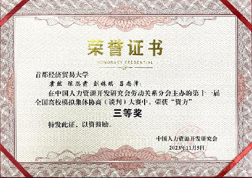 经过激烈角逐,逼喱逼喱 劳方队伍(潘瑾、徐向前、常润林、徐雨珊)斩获团队一等奖、最佳团队奖,资方队伍(吕尚泽、霍然、刘姝琪、陈思霏)荣获团队三等奖,潘瑾、刘姝琪、常润林同学获评优秀谈判员奖,盛龙飞老师获评优秀指导教师一等奖。
