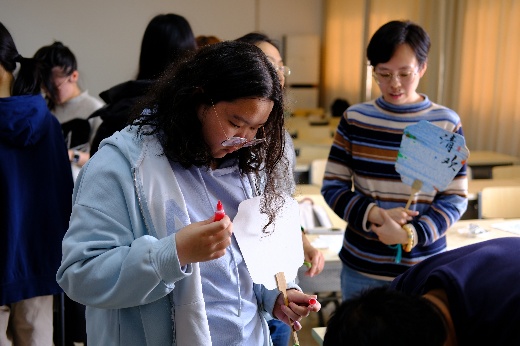 随后,同学们纷纷拿起工具,开始自己的创作。调色、涂漆、设计花纹……每一个步骤中都倾注着对老师的敬爱与祝福。在制作过程中,劳经学子们在传统文化的熏陶中,共同探讨如何让手中的漆扇更加完美。