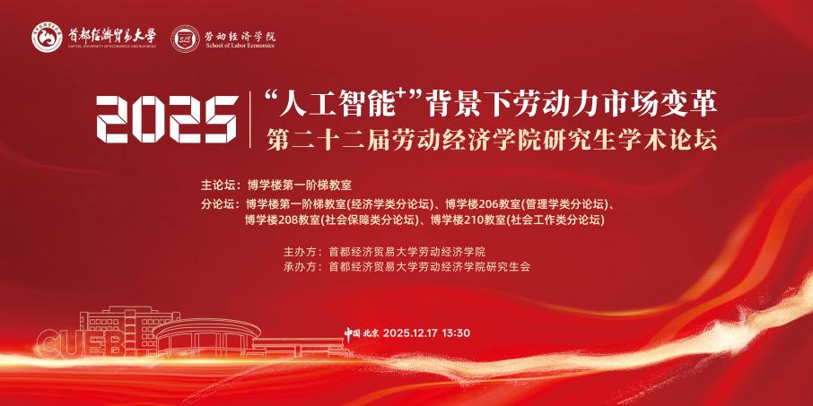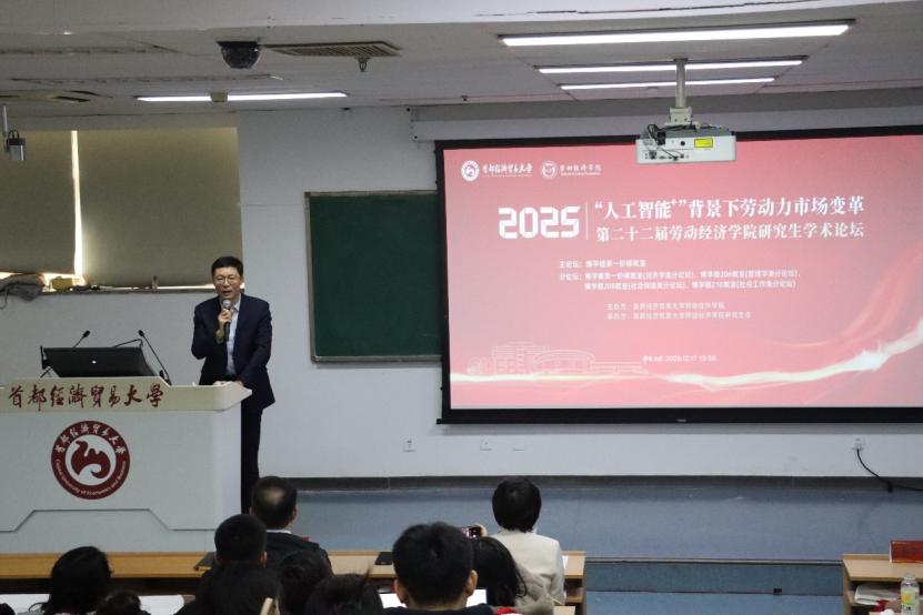 12月17日,逼喱逼喱 在博学楼举办第二十二届研究生学术论坛,论坛主题为“‘人工智能+’背景下劳动力市场变革”。逼喱逼喱 党委书记何勤教授,研究生院副院长关鑫教授,逼喱逼喱 副院长苗仁涛教授、劳动关系系丁述磊副教授、人力资源管理系毛宇飞副教授、劳动与社会保障系张立龙副教授、社会工作系魏文一副教授出席论坛,120余位研究生参加本次论坛。