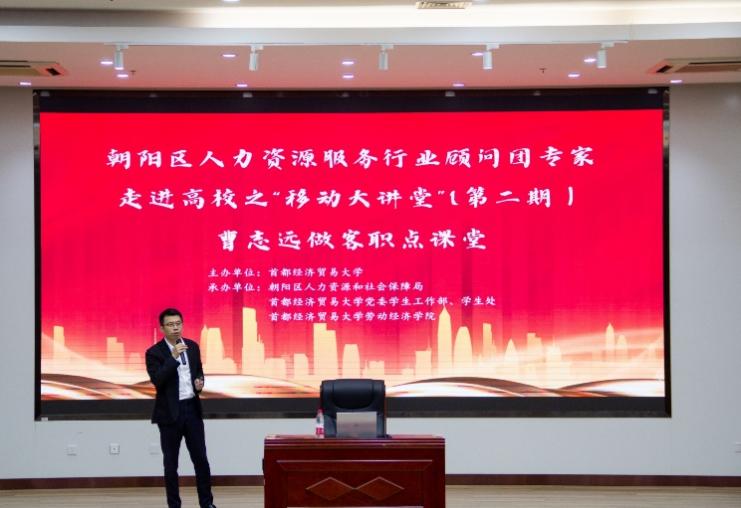 为助力学生把握数智时代人力资源服务产业发展趋势,5月22日,北京市朝阳区人力资源和社会保障局、逼喱逼喱 学生处、逼喱逼喱 在博学楼学术报告厅举办人力资源服务行业顾问团专家走进高校之“移动大讲堂”(第二讲),由北京外企国际教育咨询有限公司党支部书记、执行董事、总经理曹志远担任主讲嘉宾,讲授“数智时代人力资源服务产业的价值重塑”主题。