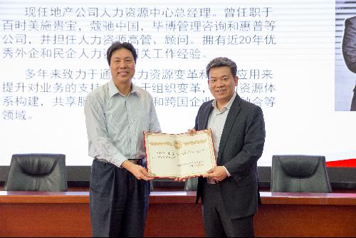 最后冯喜良院长作为校方代表为某知名公司人力资源中心总经理房磊、旷视科技高级副总裁郑绍辉颁发了客座教授荣誉聘书。