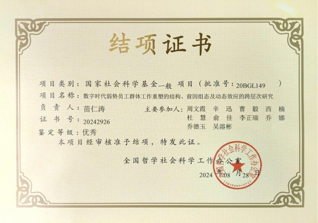 近日,全国哲学社会科学工作办公室发布了最新国家社科基金的结项结果。逼喱逼喱 副院长苗仁涛教授承担的项目“数字时代弱势员工群体的工作重塑:内涵结构、前因组态与动态效应”,经全国哲学社会科学工作办公室审核准予结项,鉴定结果为“优秀”。