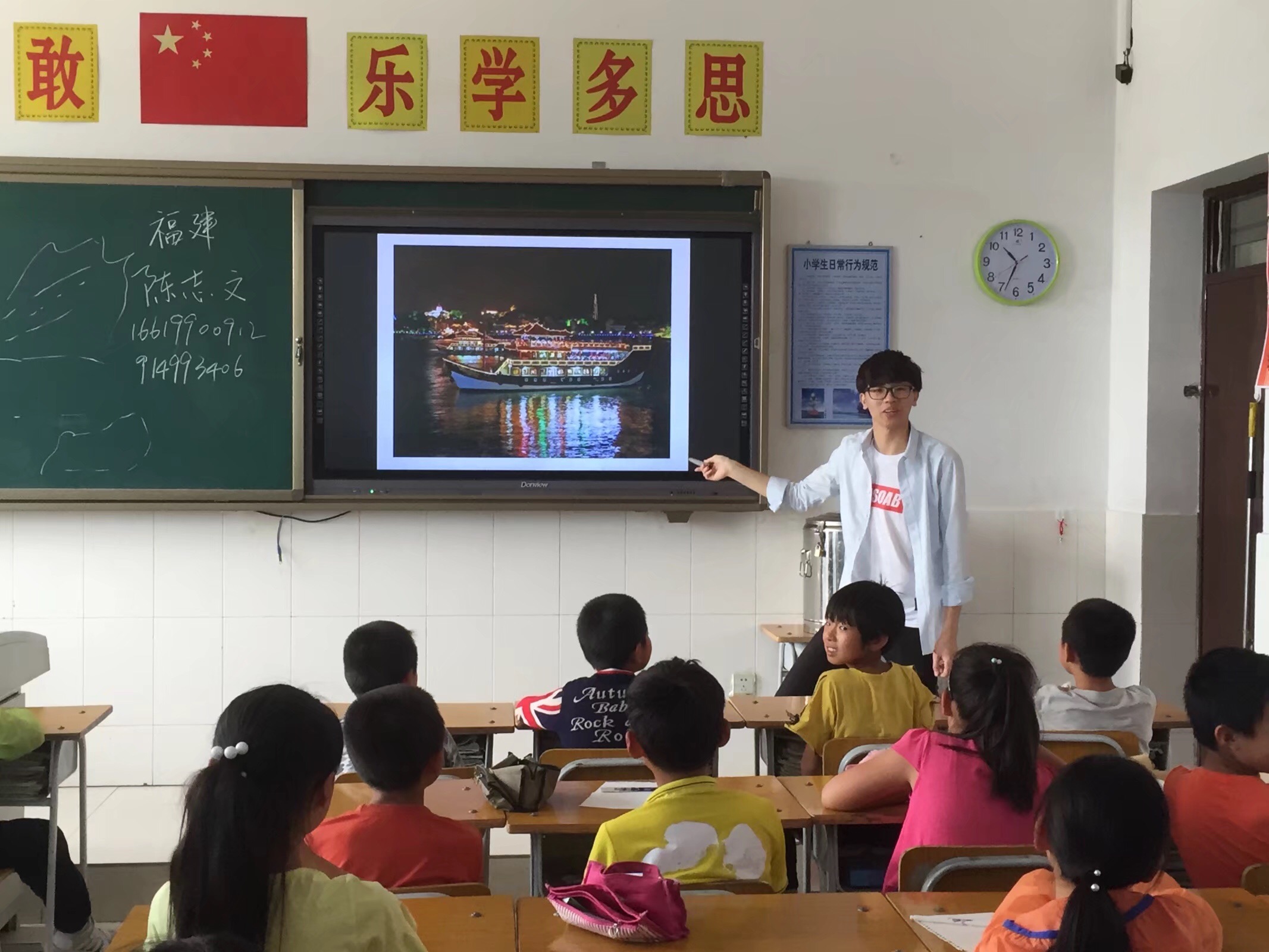 吃过午饭,他们在镇上的小旅店经过简单的休整,重新回到学校。那时,学校的杜老师早已为这些“小老师”每人安排了一位高年级的学生作为小助手。他们来到第二天上课的班级与同学们见面确定班级,并调试阶梯教室的设备。并在小助手的带领下,他们参观了学校。与此同时,他们也与官小的老师几次更改课程安排,不仅需要考虑到孩子们的正常上课时间,还要考虑每位同学体力是否足够。并且还需要调整有空闲时间的同学到正在上课的班级去照相。