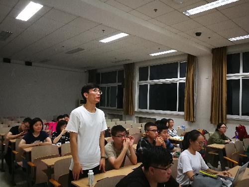 首先,全体同学起立高唱国歌,在同学们严肃而热情的歌声中可以感受到大家对国家的真情。紧接着,曹红旗同学对习总书记此次北大之行的情况进行了详细介绍,习近平总书记此次北大之行看望教师代表,与中外同学互动交流,参与师生座谈会,对比14年与此次的总书记寄语青年,我们能看到习总书记对青年群体的美好期待。然后,曹红旗同学重点介绍了习总书记对于青年群体提出的四点要求:一是要爱国,忠于祖国,忠于人民,即梦想不能停留在口号上,在任何时候都要将自己的理想与国家与人民相结合;二是要励志,立鸿鹄志做奋斗者,奋斗精神是每个青年都应有不懈追求的;三是要求真,求真学问,练真本领,不能满足于对碎片化信息和快餐化知识的获取,要坚持不断提升自己的竞争实力;四是要力行,知行合一,做实干家,社会主义是干出来的,青年人最不能有的就是眼高手低,只说不做。