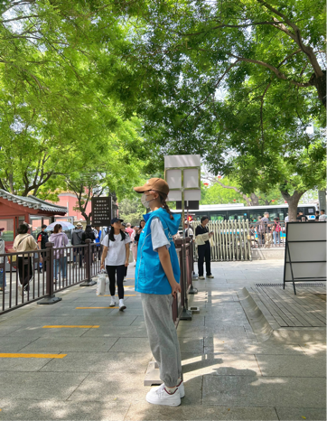 上午十一时,志愿者们准时到达集合地点等候。工作伊始,游客已经源源不断,领队为执勤组的志愿者们快速分好岗并带领他们到达指定地点开展工作。亭子旁、山脚下,一抹抹蓝色的身影在游客迷路时指路答疑,在通道堵塞时调整秩序。每位志愿者都明确自身职责,认真敬业,确保活动有序进行。