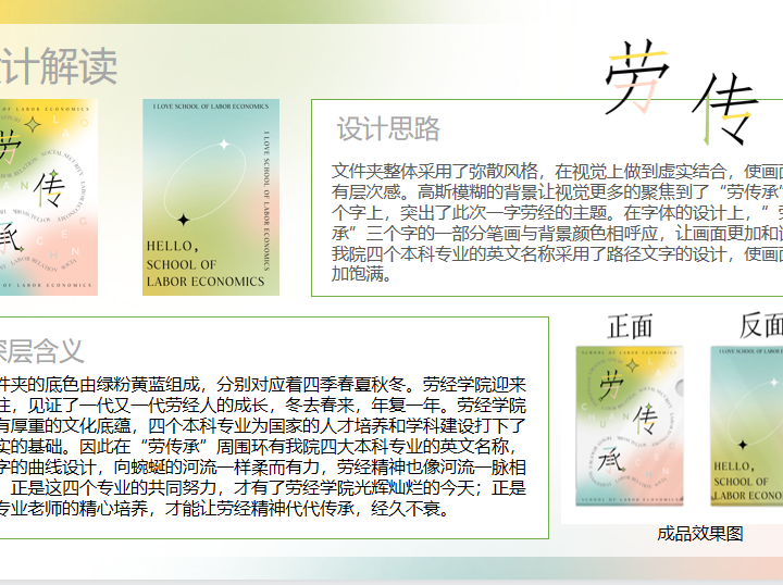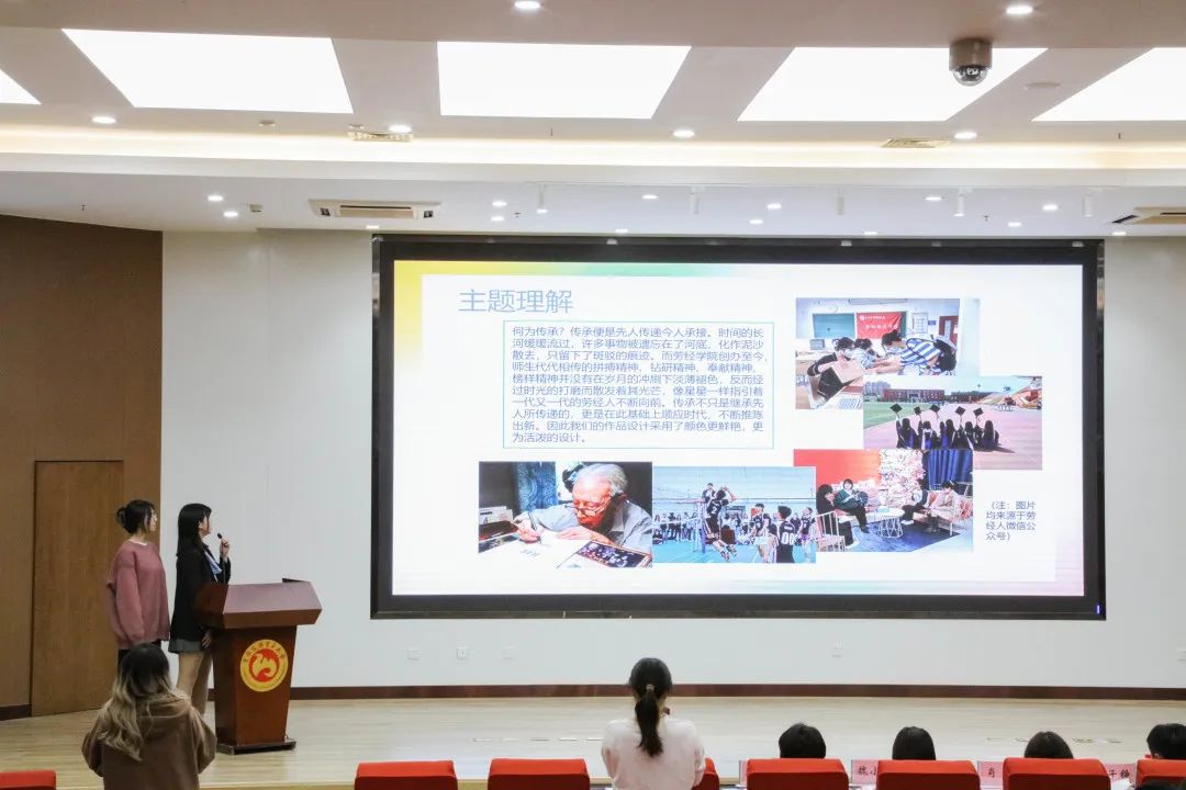 在主赛道的角逐中,参赛选手逐一介绍了自己作品的创作过程,解读各自作品的创作理念,他们将作品与学院生活相结合,设计出了独具特色的钥匙扣和文件夹,用作品表达对劳经精神的理解,用作品传递对劳经情怀的传承。