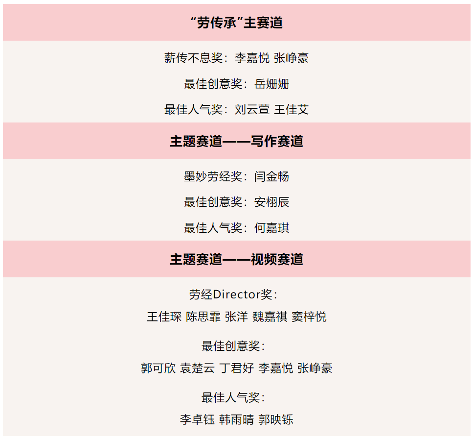 在策划人员和参赛选手的共同努力下,本届“一字劳经” 在精心筹备中顺利举办。而在所有劳经人的关切下,本次活动也在温馨的氛围中完美落幕。在此,我们特别感谢所有参赛选手的积极参与和筹办人员的辛勤付出,更向每一位劳经人致敬。本次“一字劳经”活动圆满收官,让我们一起加油向未来。