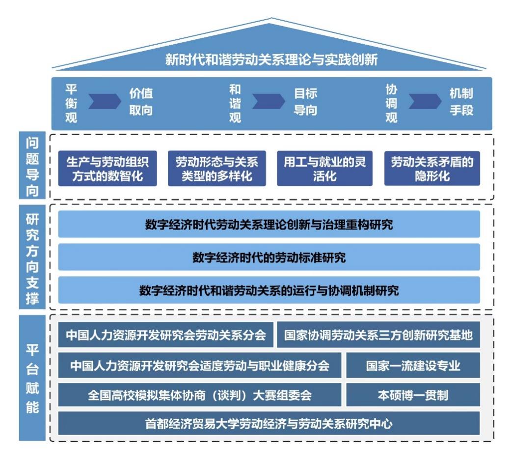 在新时代中国特色的劳动科学体系框架下,劳动关系专业将以构建新时代和谐劳动关系为根本出发点,以“和谐观”为目标导向、“平衡观”为价值取向、“协调观”为机制手段,围绕生产与劳动组织方式的数智化、劳动形态与关系类型的多样化、用工与就业的灵活化、劳动关系矛盾的隐形化等特征,将数字技术变革对劳动关系的影响作为核心研究主题,重点关注数字经济时代劳动关系理论创新与治理重构研究;数字经济时代的劳动标准研究;数字经济时代和谐劳动关系的运行与协调机制研究三个重点课题。