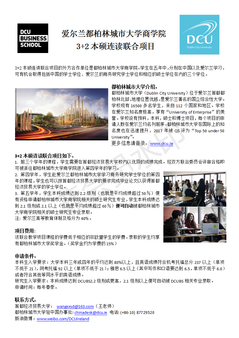 爱尔兰都柏林城市大学商学院“3+2本硕连读”联合项目