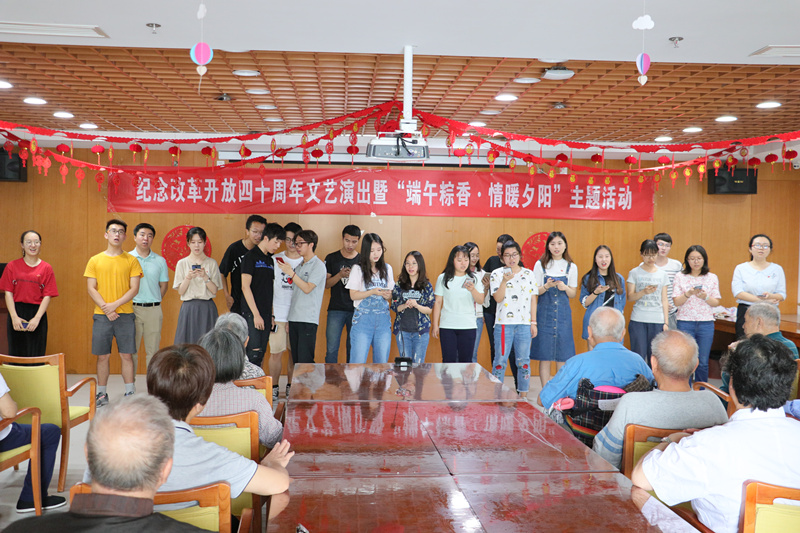 演出以改革开放四十周年的时间线为主要线索,用红歌的形式串联起四十年来祖国走过的风雨岁月和取得的辉煌成就,旨在通过这样的方式引起老人们的共鸣,也强化同学们的爱国意识,坚定理想信念。敬老院李宝宝爷爷以一首《小白杨》开场,虽然年事已高,但依然精神矍铄,歌声嘹亮,博得现场老人和同学们阵阵掌声。同学们依次带来了《军港之夜》《年轻的朋友来相会》《在希望的田野上》《长江之歌》《我和我的祖国》《春天的故事》《走进新时代》等歌曲和《绽放》《咖喱咖喱》等舞蹈,引发全场一次又一次的大合唱,活动现场气氛热烈、其乐融融。