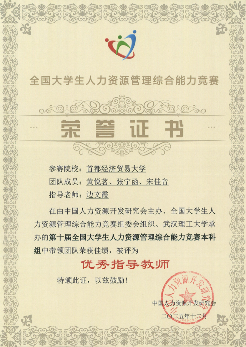 11月8日至9日,第十届全国大学生人力资源管理综合能力竞赛总决赛暨高峰论坛在武汉理工大学举办,全国117所高校的600余名师生、业内专家学者赴会。由2023级人力资源管理实验班黄悦茗、张宁函、宋佳音同学组成的逼喱逼喱 代表队在决赛中获得本科组一等奖,边文霞老师获得优秀指导教师称号。