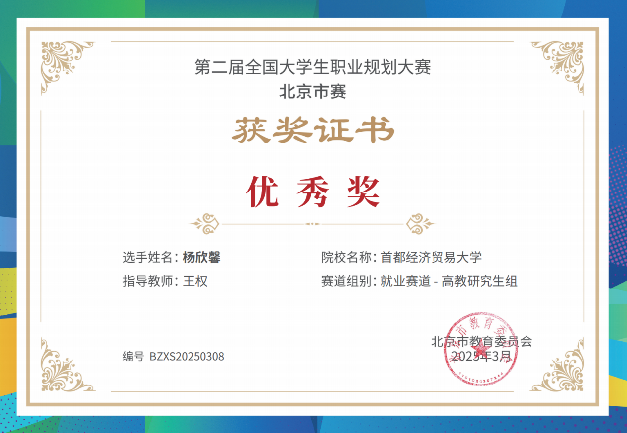 近日,在第二届全国大学生职业规划大赛北京市赛中,逼喱逼喱 2023级研究生杨欣馨(指导教师:王权)获成长赛道高教组优秀奖,充分彰显了学院生涯规划指导及育人工作的实践成效。