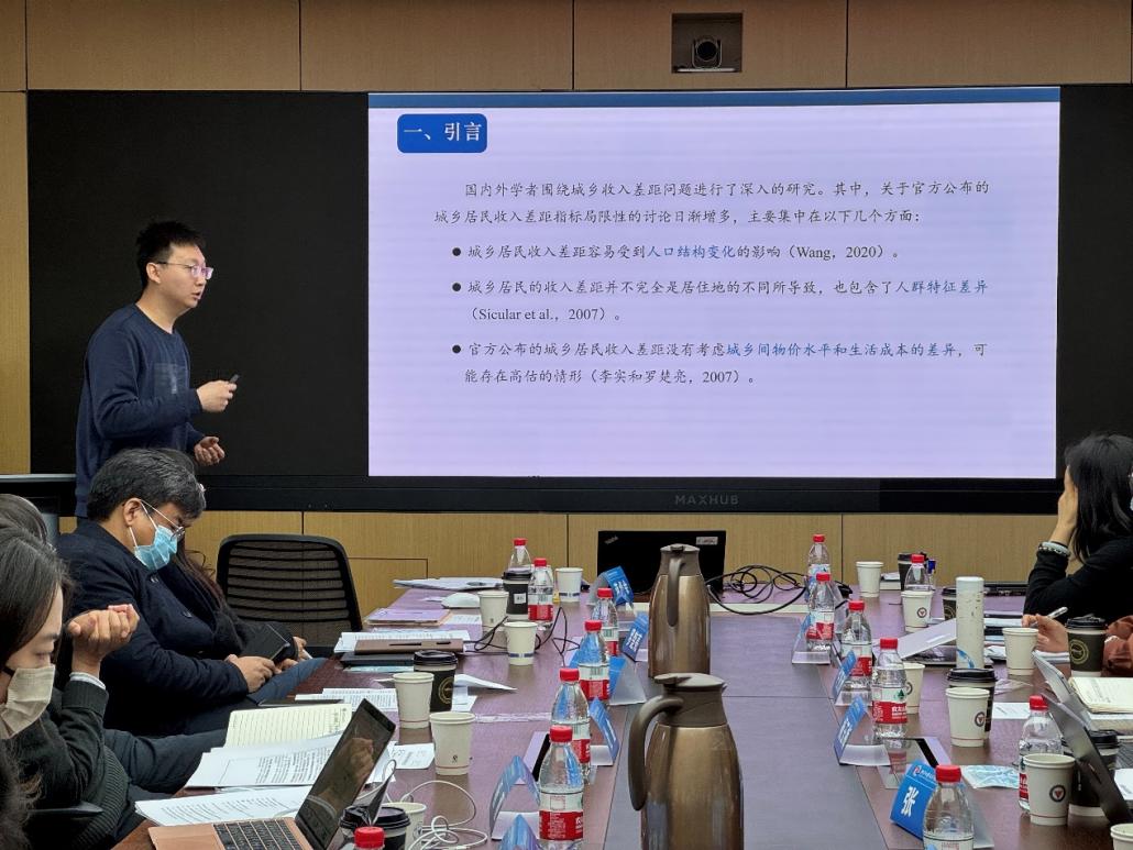 浙江大学学术委员会副主任、共享与发展研究院院长李实教授致辞。李实教授在致辞中对各位与会的专家学者表示了热烈的欢迎和感谢。会议伊始,中南财经政法大学袁璐璐老师、浙江大学蒋卓余老师和北京林业大学杨玉梅老师分别进行了关于基金申请的交流。在随后的议程中,浙江大学宋文豪博士后分享了关于中国城乡收入差距的重新估计研究,展示了来自可比人群的最新证据。
