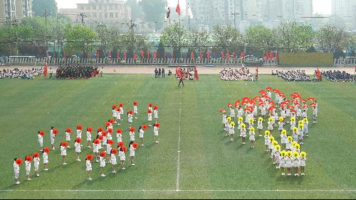 在一步一动中,动态的三棱锥跃然场上,独具创意的立体图案设计,整齐划一的动作赢得了全场惊叹。接下来,队形继续变换。红色的小人儿向前奔跑,瞬间点燃火炬,熊熊燃烧。恰如,逐梦的少年点亮希望。