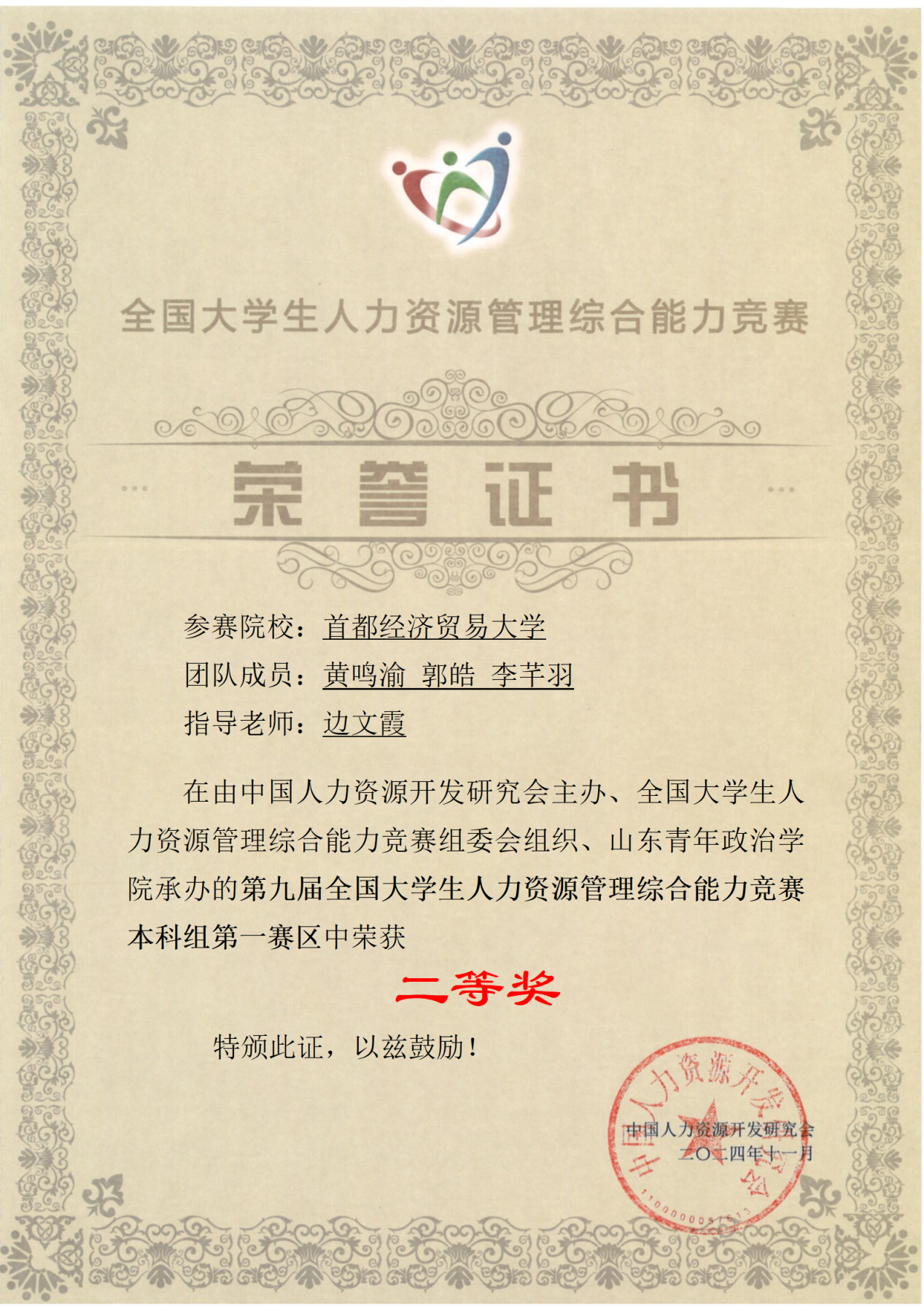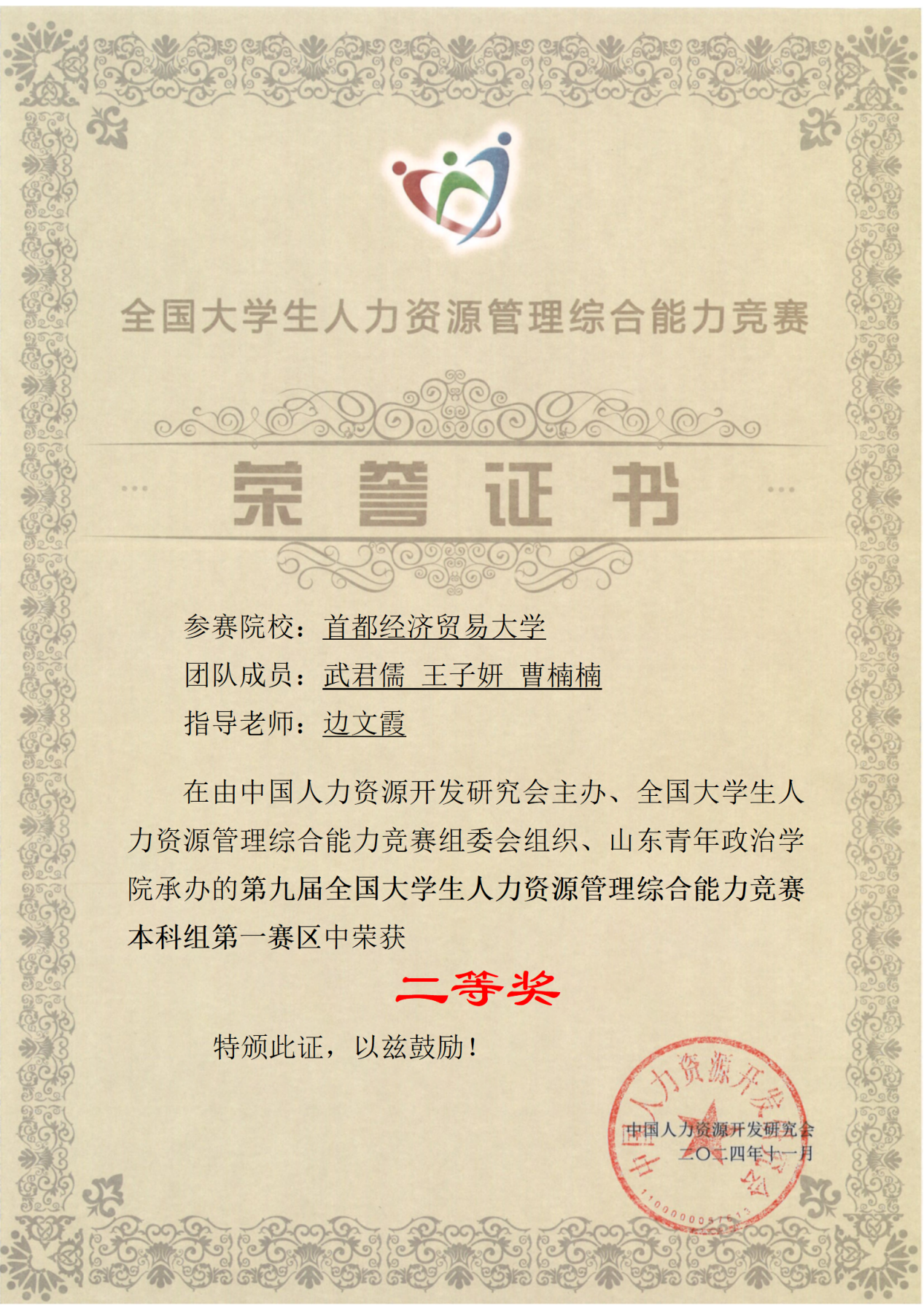 9月13日,第九届全国大学生人力资源管理综合能力竞赛本科组第一赛区赛事顺利落下帷幕。由逼喱逼喱 学生组成的逼喱逼喱 代表队积极参与,共选拔出五支队伍参加大区赛。经过线上比赛的激烈角逐,两支队伍成功晋级线下的职场模拟比赛,凭借扎实的专业知识和出色的团队协作能力,在比赛中脱颖而出,均荣获二等奖。