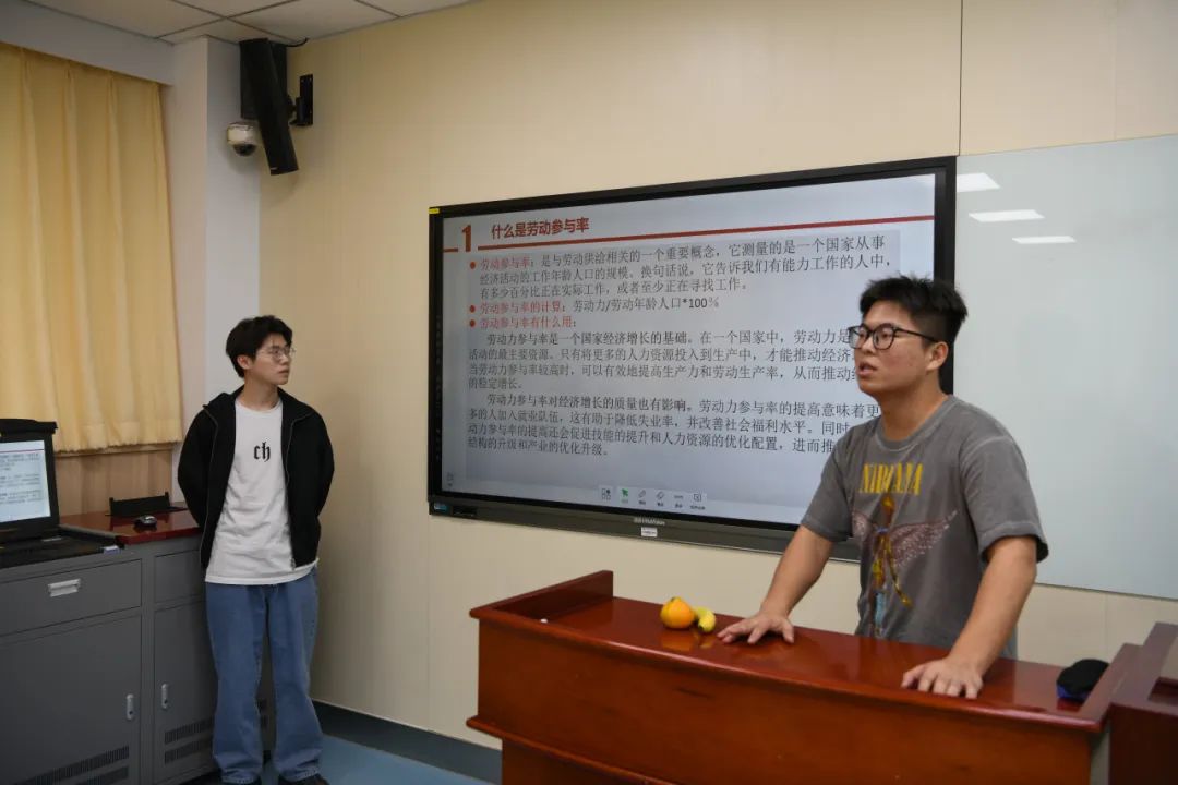 接着是小组展示环节,同学们在阅读书籍、讨论与思考后,以“劳动参与率”“移民”“保留工资”“性别工资差距”四个主题为切入点,进行分享汇报。同学们结合书中内容、具体案例及数据以及所学的知识,不仅回答了老师布置的问题,更谈到了自己的理解。