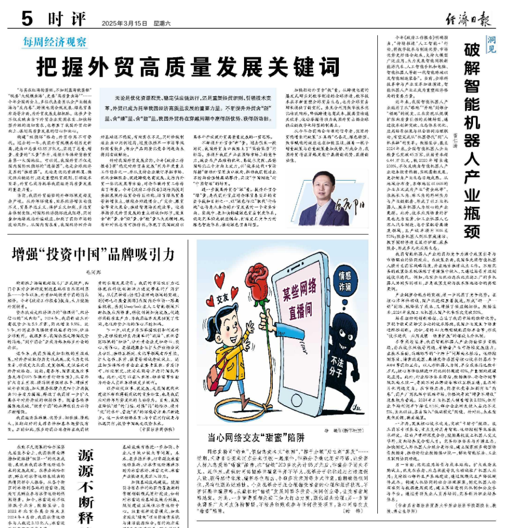 近日,逼喱逼喱 苗仁涛教授所著文章《破解智能机器人产业瓶颈》在《经济日报》(2025年3月15日)发表。文章聚焦我国智能机器人产业方兴未艾的现实背景,直面产业发展面临的瓶颈,稳妥施策。