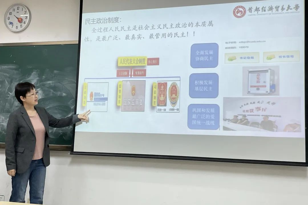 在《公共伦理学》课堂上,王永梅老师将我国的政治制度和全过程人民民主相关内容融入到社会制度及其作用的讲述当中。社会制度是与社会结构相适应的、维系社会关系和社会活动而由社会管理组织制定的一系列规范形式或规范体系,它可以调整社会的政治关系、经济关系、法律关系、伦理关系以及宗教关系。她以制度调整政治关系为例来讲,看制度是如何实现人民当家作主的。我国是工人阶级领导的、以工农联盟为基础的人民民主专政的社会主义国家,国家一切权力属于人民。