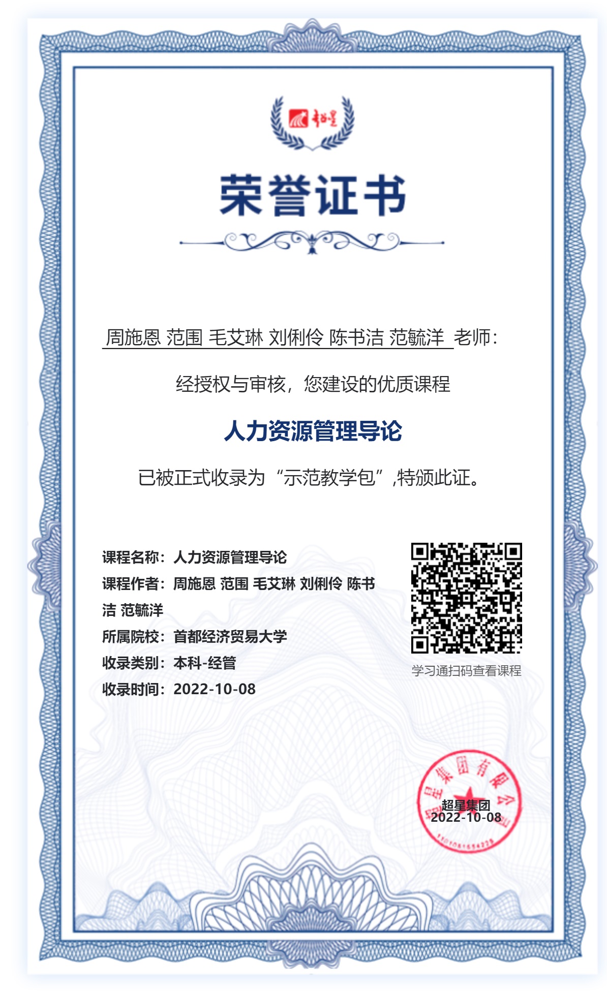 据悉,我院《人力资源管理导论》全套课程资料已被全国最大的“学习通”教学平台收录为“示范教学包”。视频课程在“智慧树”上线的仅仅两个学期就被国内75所高校选用,在全国起到了示范引领作用。配套教材在不足一年半的时间全部售罄,新修订的第2版教材系统融入了党的“二十大”会议精神,课程思政主题鲜明,将于今年“五一”前后面世。