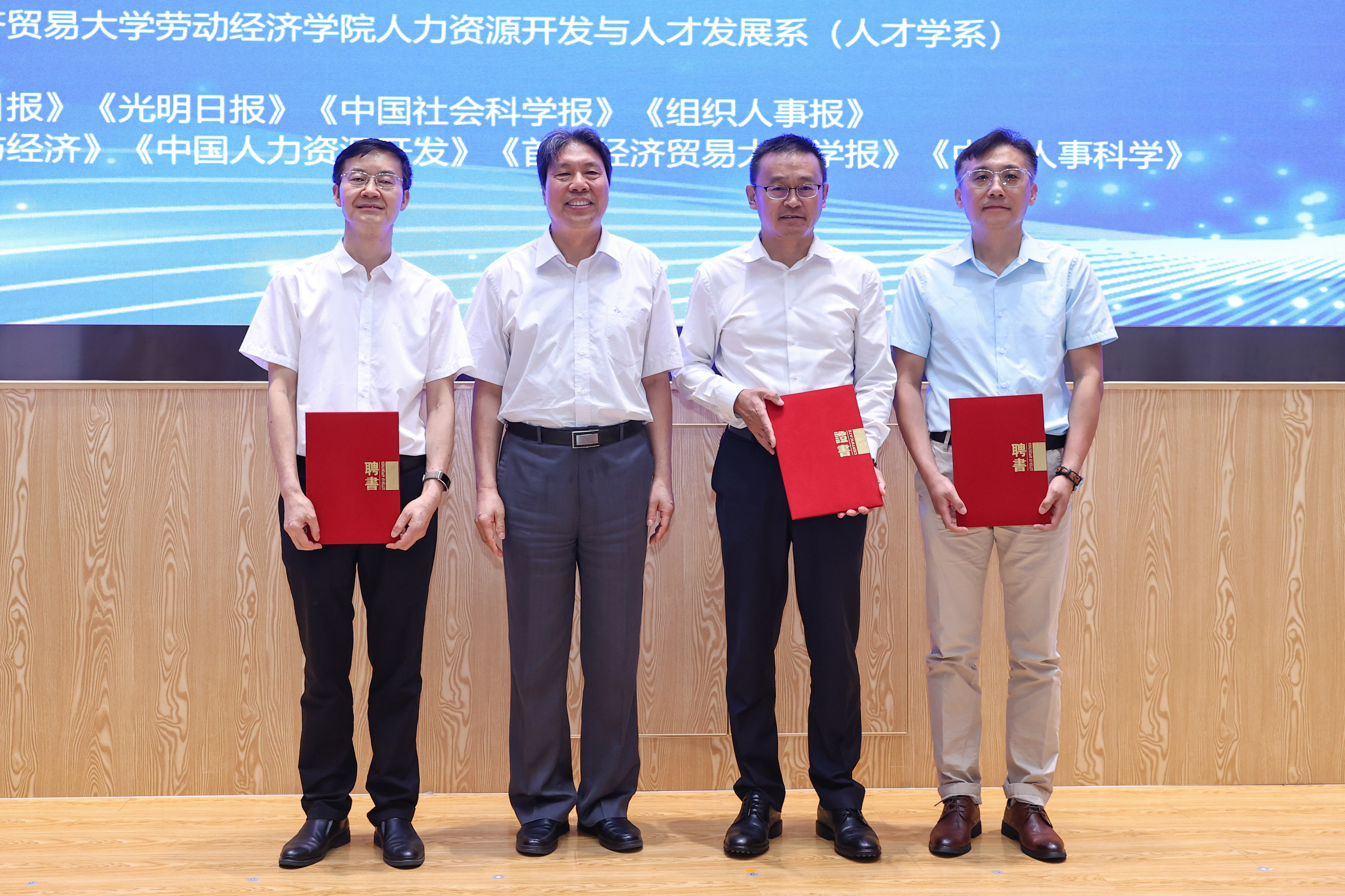 之后主论坛进入颁发聘书环节,中国人才研究会学术委员会委员、常务理事侯建东教授、北京东方慧博人力资源顾问股份有限公司孙大元董事长、中国民航管理干部学院丁雪峰副教授获聘兼职硕士研究生导师。冯喜良教授为三位颁发了兼职硕士研究生导师聘书。