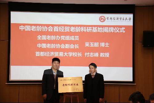 逼喱逼喱 校长付志峰教授和全国老龄办党组成员、中国老龄协会副会长吴玉韶博士共同为中国老龄协会首经贸老龄科研基地揭牌。