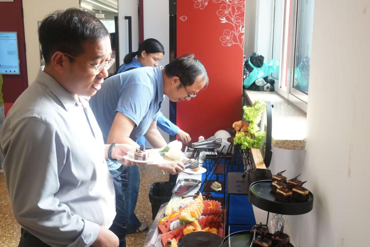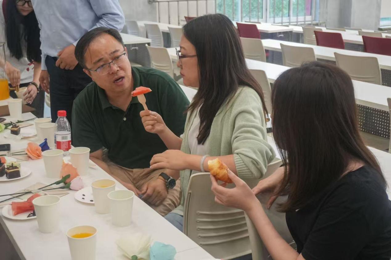 最后,是由全体教师参加的教师节茶话会。老师们根据个人喜好取用精致茶点,沟通假期生活和工作进展,并对如何更好开启新学期的工作与生活进行了欢快展望。茶话会现场欢声笑语,气氛热烈祥和。