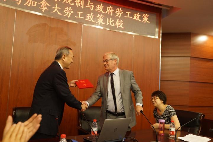 在逼喱逼喱 六十周年校庆之际,加拿大劳工部副部长安东尼▪吉尔斯教授也迎来了自己的六十岁生日,在会见中部长欣然接受邀请,成为逼喱逼喱 名誉教授,冯培为安东尼▪吉尔斯教授颁发聘书。