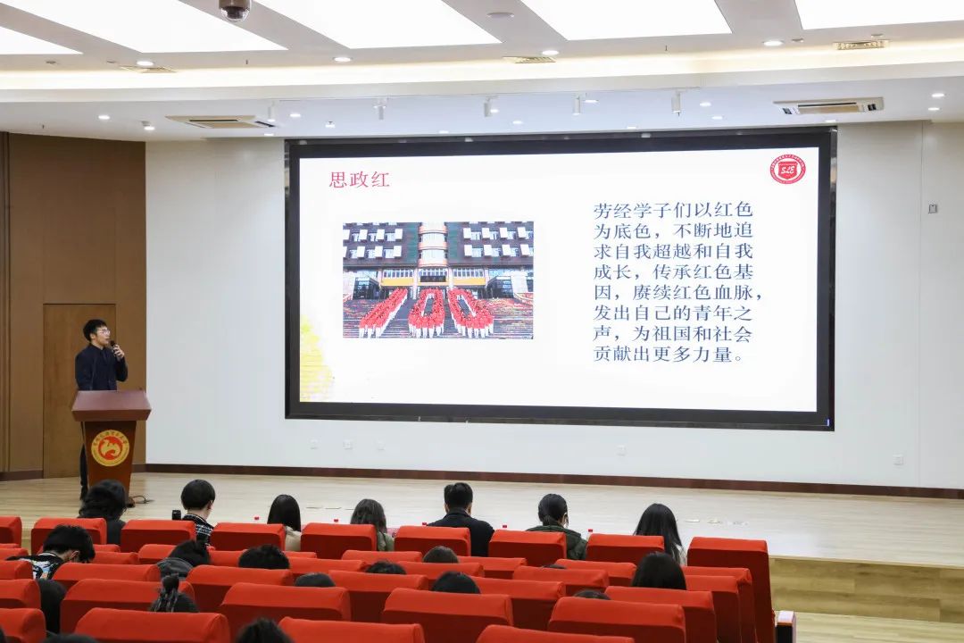 在主赛道的角逐中,参赛选手逐一介绍了自己作品的创作过程,解读各自作品的创作理念,他们将作品与学院生活相结合,设计出了独具特色的钥匙扣和文件夹,用作品表达对劳经精神的理解,用作品传递对劳经情怀的传承。