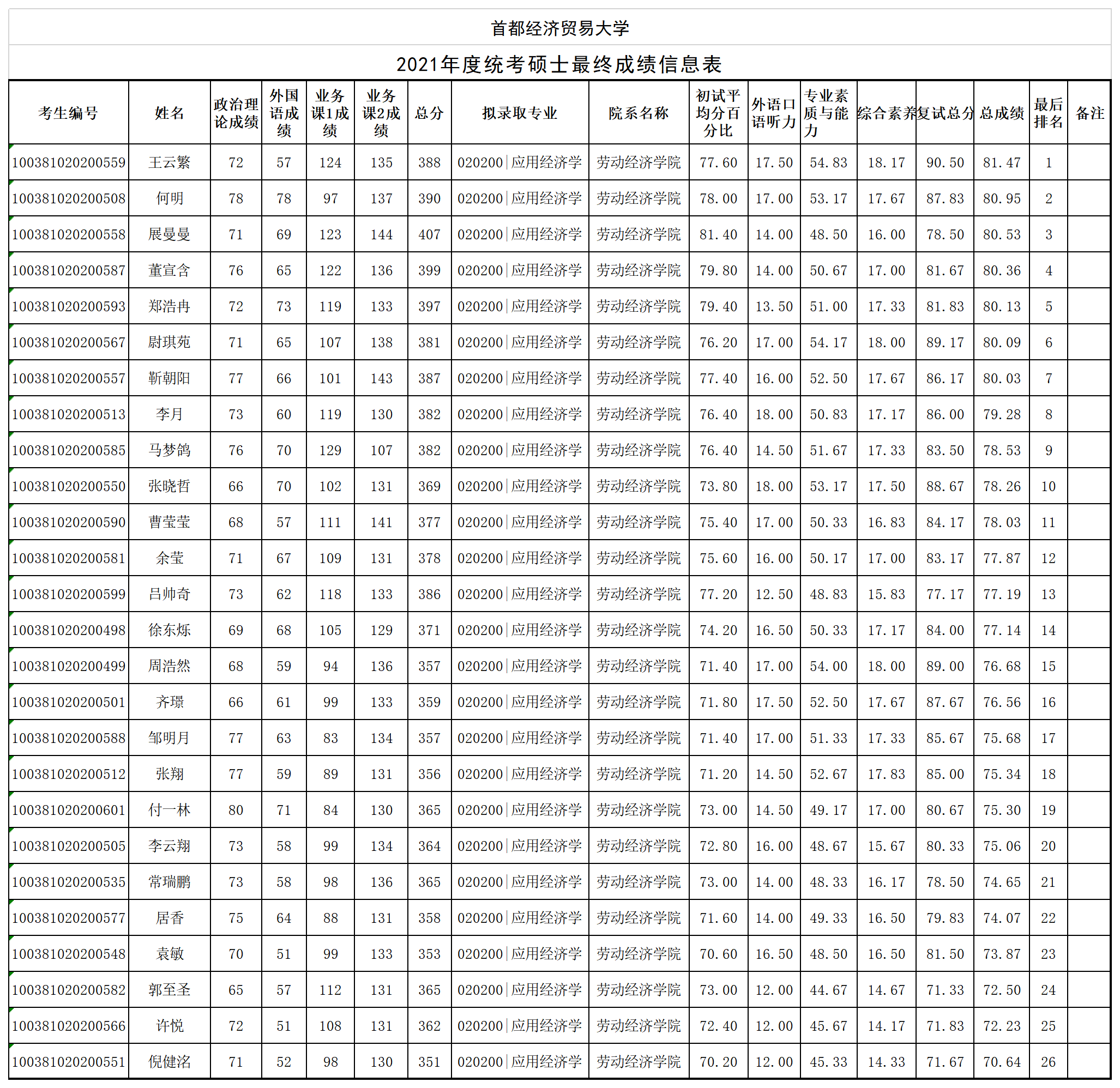 【公示】首经贸逼喱逼喱 2021年度统考硕士最终成绩公示